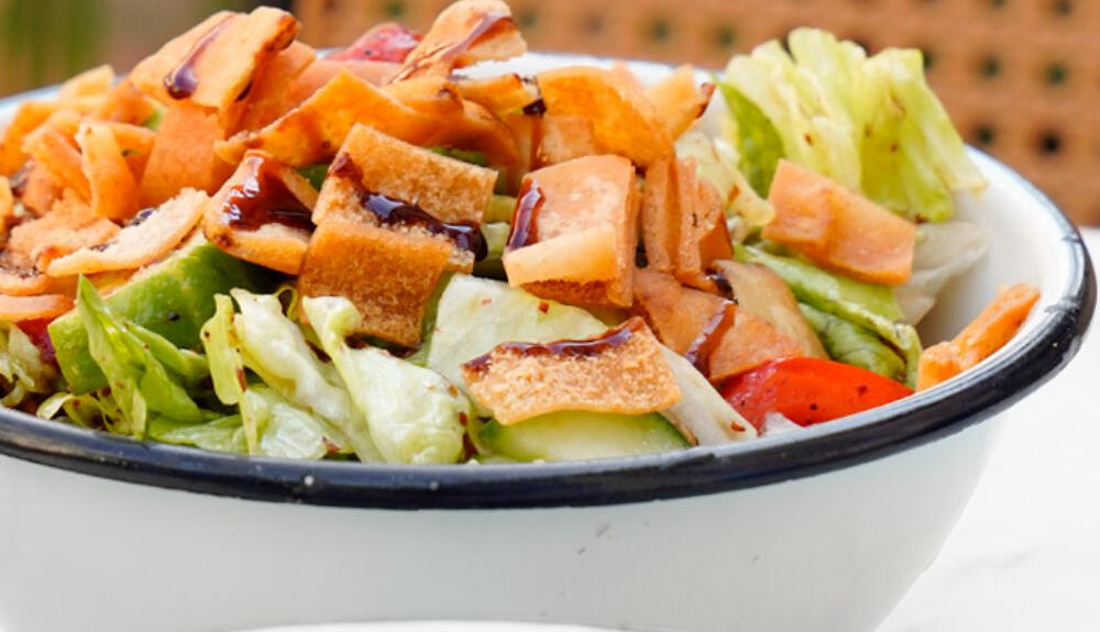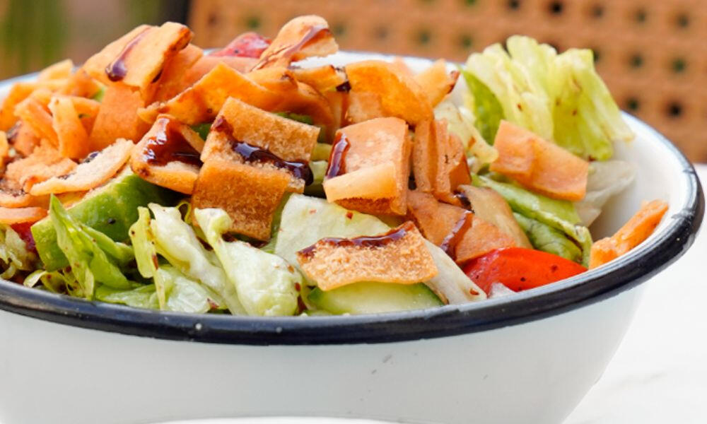 Popular salad made from toasted or fried pieces of khubz combined with mixed greens and other vegetables, such as radishes and tomatoes.