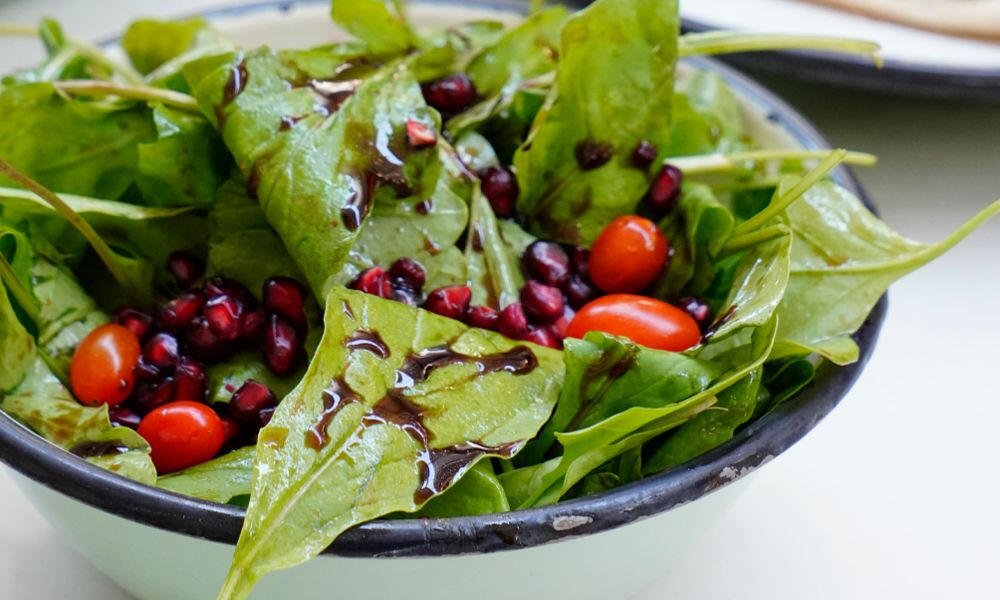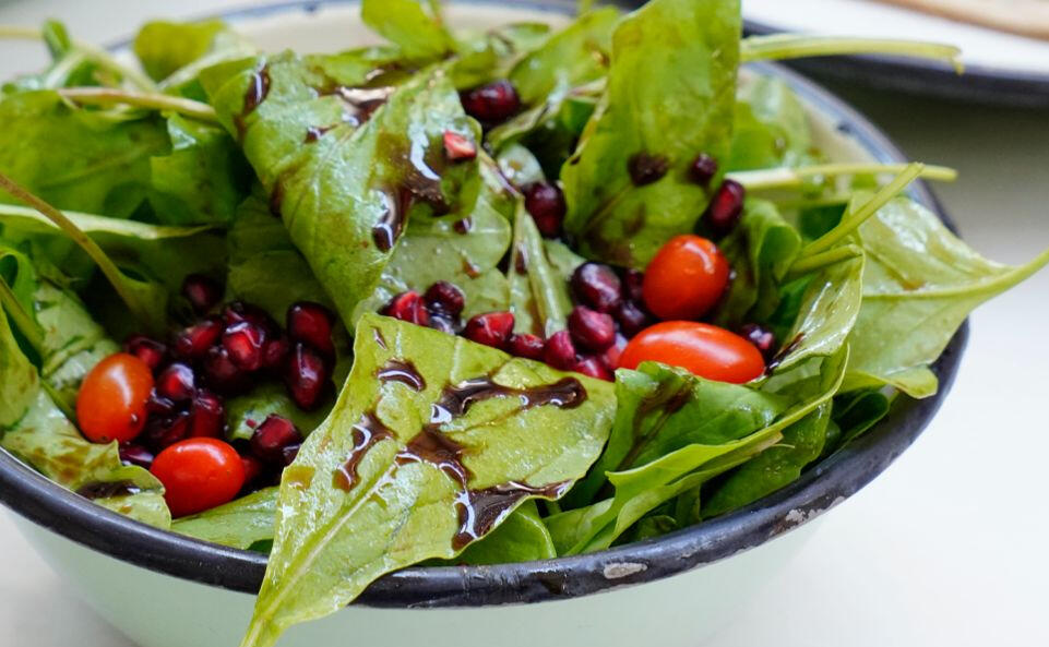 A tasty mix of rocca leaves with pomegranate, cherry tomatoes and pomegranate dressing.