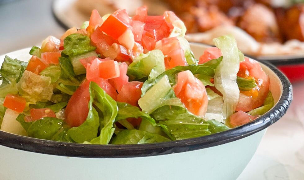 سلطة خضراء بسيطة مكونة من الطماطم والخس ومتبلة بزيت الزيتون والخل