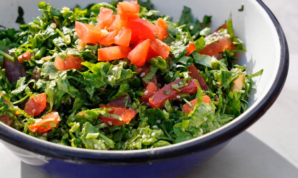 سلطة شامية تقليدية مصنوعة من البقدونس المفروم ناعماً مع الطماطم والنعناع والبصل والبرغل غير المطبوخ والمتبل بزيت الزيتون
