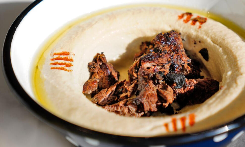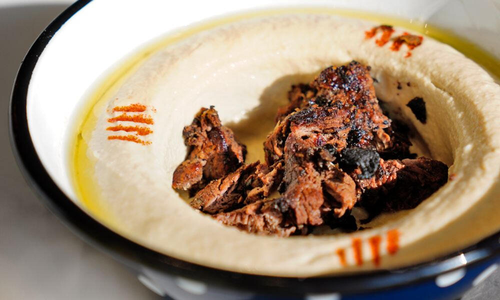 Savory dish made from cooked, mashed chickpeas blended with tahini, lemon juice, and garlic with loumi meat on top.