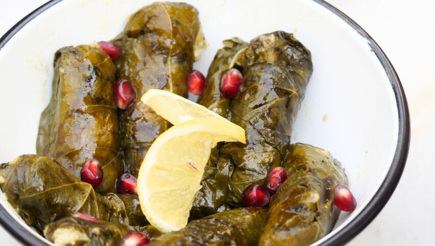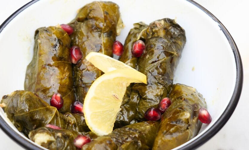 These stuffed grape Leaves are made with a spiced rice mixture and pomegranate sauce.