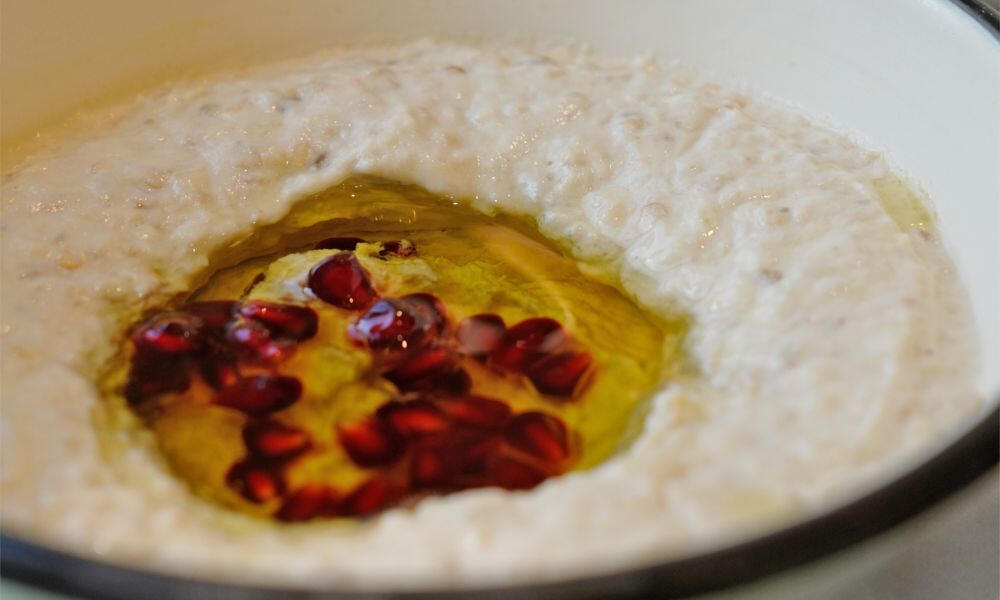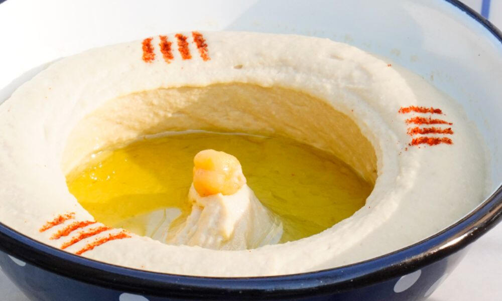 طبق حمص تكة خليل المميز، حمص مهروس ممزوج مع الطحينة. يقدم مع الخبز